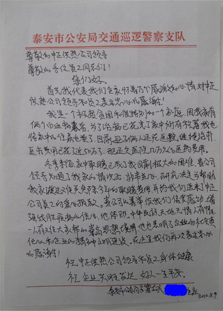 泰安市交警支隊一位家有兩個重病患者的職工深處困境,我公司得知其情況后,免除了該職工家今年冬季的采暖費,并在全公司進(jìn)行一次獻(xiàn)愛心捐款活動。